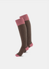 Een schietsok voor dames, handgemaakt van luxe wolvezels in de kleuren Lila en Olijf of Roze en Taupe of Roze en Groen.