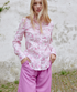 Schitterende damesblouse van wit linnen met fuchsiaroze bloemmotieven.